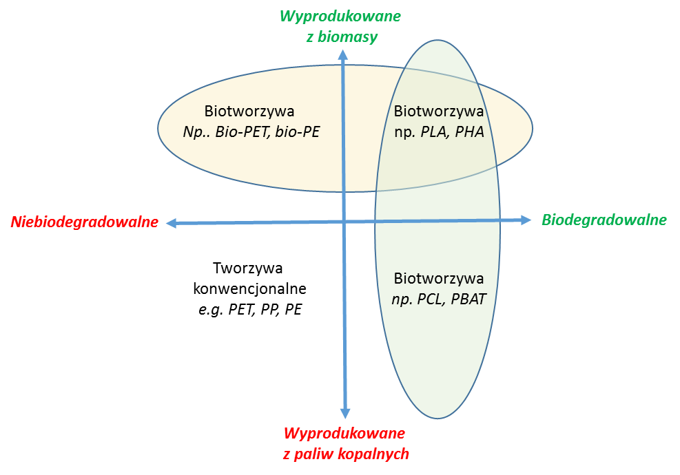 Ponad 95% globalnej produkcji tworzyw sztucznych jest produkowanych na bazie komponentów ropy naftowej. Wyczerpywanie się zasobów kopalnych oraz zwiększająca się w szybkim tempie ilość odpadów tworzyw sztucznych przyczynia się do poszukiwania nowych, bardziej zrównoważonych materiałów, wytwarzanych z odnawialnej biomasy (np. skrobi, celulozy) oraz podatnych na rozkład biologiczny. Do tworzyw biodegradowalnych zaliczamy materiały, które ulegają w określonym czasie, pod wpływem działania mikroorganizmów (bakterii, grzybów) rozkładowi do dwutlenku węgla/metanu, wody, związków nieorganicznych lub biomasy, w zależności od dobranych warunków. Jednakże nie każdy biopochodny polimer (wyprodukowany z biomasy) będzie podatny na rozkład biologiczny (rys.4.). Niektóre tworzywa wytworzone ze źródeł odnawialnych odzwierciedlają właściwości ich konwencjonalnych odpowiedników, np. bio-PET. Stanowią one substytuty tradycyjnych tworzyw sztucznych o takiej samej strukturze, takim samym spektrum zastosowań, ale też trwałości i możliwości poddania określonym procesom recyklingu [6,7].